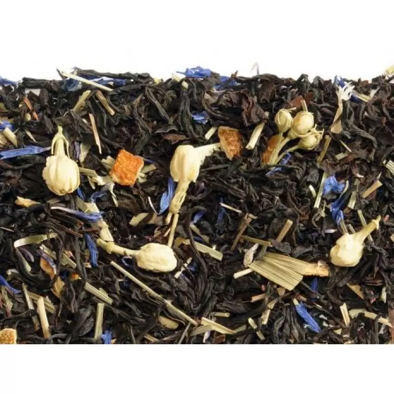 Черный чай с ароматом бергамота прекрасно гармонирует с цедрой апельсина и лемонграссом. Цветки жасмина и лепестки василька придают напитку необычный вкус и аромат. Состав - чай черный рассыпной листовой крупный, цедра апельсина, лемонграсс, цветки жасмина, лепестки василька, ароматизатор.